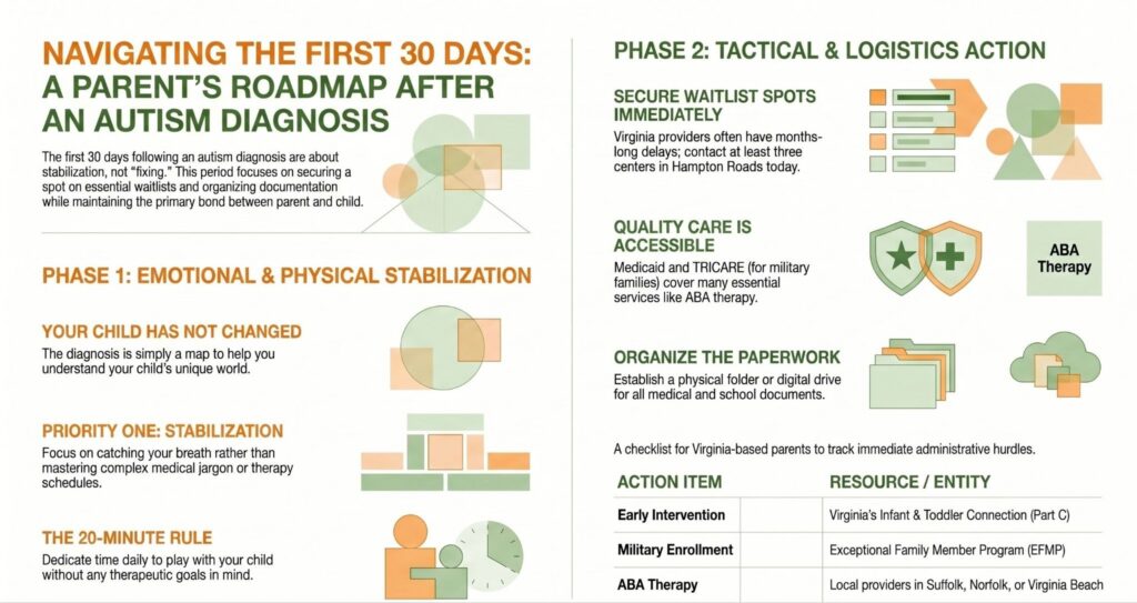 After an autism diagnosis, your immediate priority is to apply for Virginia’s early intervention services and get on waitlists for Applied Behavior Analysis (ABA) therapy. Because providers in the Hampton Roads area often have months-long delays, securing a spot now buys you time to process your emotions without feeling like you are losing precious days. Focus on one practical step at a time: address your insurance needs, call providers in Suffolk or Norfolk, and then allow yourself to simply be a parent.